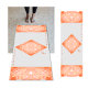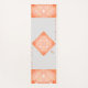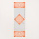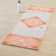 Unroll a sanctuary of serenity. This beautiful mat features a stunning modern Indian mandala design, its geometric patterns rendered in a calming palette of subtle orange hues. The intricate design adorns both the top and bottom of the mat, and the centre where it’s positioned in a striking diamond formation on a light grey background.