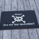 Cute Pirate Skull Black Door Mat, Custom Text. A kawaii pirate skull and crossbones "jolly Roger" wearing a cute spotted hair bow on a black background. The text is customisable if you'd like to change my "Ahoy!! Dry yer feet landlubbers". Suitable for all pirate doorways.
