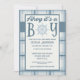 Ahoy it's a boy! These baby shower invitations have a classic nautical feel with a ship's wheel illustration and a plaid background in shades of blue and cream.