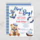 Ahoy it's a boy teddy bear nautical baby shower budget invitation with a little sailor teddy bear in a navy blue sailor cap, anchor, saving ring, for a baby boy marine nautical themed baby shower, navy blue and red.