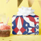 This is a roll of Patriotic American wrapping paper. The wrapping paper design was created with artificial intelligence art. The design is a Patriotic American design with white stars American stars on a vibrant blue shape with a red background. The patriotic pattern has white accents. The wrapping paper is printed in the USA.
