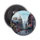 Comic book style ai illustration of downtown area of Kolkata, India architecture, motor bikes and cars. A bottle opener with an illustration of busy downtown street with buildings, restaurants, shops and people on their motor bikes.