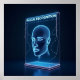 A futuristic 3D holographic display projects a human face with intricate code and circuitry, symbolising AI-powered facial recognition. Set against a neon-lit dark blue background, glowing accents highlight the technology’s precision and real-time analysis, framed by a sleek silver border with bold typography.