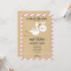 A baby shower invitation featuring an illustration of a stork carrying bundle with postmark over a manila background with pink stripe border. Twine inspired design at bottom and on back. Personalise with details of your occasion.