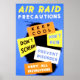 WWII vintage artwork. Blue poster for Air Raid Precautions. It says to "keep cool" "don't scream" "don't run", "prevent disorder", and "obey all instructions" .