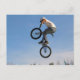 Photograph of a young man jumping high in the air on a blue BMX bike