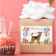 Destei's original cartoon illustration of a cute Airedale Terrier breed dog. The dog is placed in a colourful birthday setting with pastel colour birthday balloons, gifts and a bunting banner. The pastel colours include pink, green, blue, red, orange and purple. The dog is standing on a yellow wood floor texture and the background has a playful pastel colour polka dot pattern.