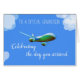 A green airplane is flying in the sky and with it are wishes for a Happy Airplane Day. This card celebrates the gift of a special person on their adoption anniversary.