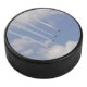 A squadron of military jets performs manoeuvres among the cumulus clouds above a summer air show.