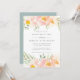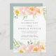 Elegant watercolor floral engagement party invitation frames your engagement celebration details with a border of sheer pastel watercolor flowers in light peach and blush pink, with mint green foliage.