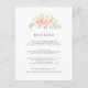 Designed to coordinate with our Airy wedding collection, this chic floral guest information card features a simple spray of pastel peach watercolor flowers and mint green foliage, topping your key wedding details, like hotel accommodations, welcome reception information, website and more. Add your custom text using the fields provided and use the Customise function to adjust fonts, sizes and spacing.