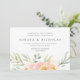 Our chic floral wedding invitation in a horizontal layout frames your wedding details with a bottom border of painted watercolor flowers and foliage in soft shades of peach and pastel green. Coordinates with our Airy wedding and event collection.