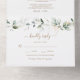 ALL IN ONE invitation. For bulk order you have to remove gust names and address. Elegant card design featuring watercolour airy greenery and gold outlined leaves, splashes, modern fonts, faux gold round frame with leaves, on a white background. Use Personalise tool to add your info. For matching items, please, visit my Greenery Gold Floral Collection.
