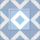 A cool geometric pattern of interlocking light blue and white diamond shapes. The white diamonds each contain a small baby blue diamond making pale blue the dominant colour of the fabric design.