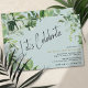 Casual and cute birthday party invitations with watercolor tropical plants on a pale blue background. "Let's Celebrate" text in a script font with your event details in the lower right corner. Can be changed to any age.
