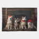 An enchanting scene captures the essence of cosiness and holiday spirit as furry companions adorned in Santa Claus hats gather around a crackling fireplace. The warmth emanating from the hearth creates a snug atmosphere for these adorable canines, while festive stockings hang in the background, enhancing the merry ambiance. The charming illustration portrays a timeless image of companionship and festive joy, perfect for celebrating the holiday season with a touch of canine charm.