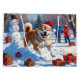 A heartwarming holiday illustration featuring a cheerful dog playing in the snow, wearing a Santa hat and surrounded by colourful gift boxes. In the background, children build a snowman beside a snow-covered Christmas tree, creating a joyful winter wonderland. Perfect for spreading holiday cheer and capturing the magic of Christmas.