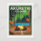 Akureyri Iceland travel poster, featuring a campfire under the beautiful northern lights.