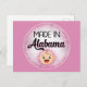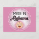 This funny postcard features a cute white baby face that says "Made In Alabama" on a Pink background. Perfect for new baby announcements or just for fun.