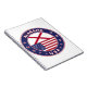 Badge of Alabama with flag of Alabama and flag of USA colors, rounded shape.