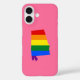 iPhone 16 case with a map of Alabama in the colours from the LGBT (lesbian, gay, bisexual, and transgender people) rainbow pride flag, rainbow love gay American state pride lgbtqiap+ design on pink background