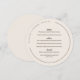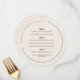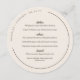 Round wedding menu in alabaster white with modern and trendy brown fonts, and your names and wedding date in a curved text along the edge of the round wedding menu. Decorate the plates at your wedding with this off-white round menu with dark brown fonts personalised with starters, entrees, dessert--and your names and wedding date in a curved text.