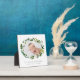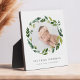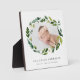 Chic photo plaque frames a favourite horizontal or landscape orientated photo of your sweet little one with an oval wreath of green watercolor foliage and white flowers. Personalise with baby's name and birth stats beneath for a unique and elegant keepsake for new parents.