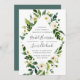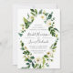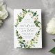 Our Alabaster wedding invitation frames your wedding details with painted watercolor greenery and foliage dotted with white peonies and roses. A modern yet organic choice in green and white with lush botanicals and handwritten lettering.