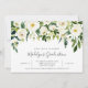 Chic floral graduation party invitation features a top border of ivory roses and white peonies with lush botanical foliage and greenery. Personalise with your graduation party details in modern hand lettered script and traditional sans serif lettering. Invitations reverse to rich jewel toned jasper green.