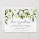 Announce your new wedding date to guests with these elegant wedding postponement announcement cards. Chic floral card features a top border of ivory roses and white peonies with lush botanical foliage and greenery, and "love is patient" in calligraphy script lettering. Personalise with your rescheduled wedding details in modern hand lettered script and traditional sans serif lettering. Invitations reverse to rich jewel toned jasper green.
