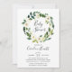 Elegant floral baby shower invitations feature a wreath of watercolor white roses and peonies with lush green botanical foliage and leaves, encircling "baby shower" in chic handwritten lettering. Personalise with your baby shower details beneath.