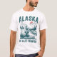 This white t-shirt features a coloured illustration of a mother grizzly bear and her cub sitting beside a flowing river in an Alaskan wilderness setting. Majestic mountains rise in the background beneath a setting or rising sun, and evergreen trees line the riverbanks. The word "ALASKA" is printed prominently at the top, and "THE LAST FRONTIER" is positioned at the bottom.