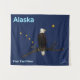 A Bald Eagle (Haliaeetus albicilla) scans the sky from his perch on a tree branch; superimposed on a flag of Alaska. Text reading "Alaska" also appears in glowing blue and white. Add your own additional text.
