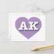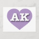 This postcard features a mellow lavender heart containing the bold white upper case letters AK, the official abbreviation for Alaska, the last frontier. The reverse side of the postcard is blank, awaiting your handwritten sentiments or customised text.