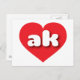 This postcard features a vibrant red heart containing the bold, white, rounded, lower case letters ak, a playful abbreviation for the state of Alaska.