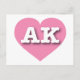 This postcard features a cool pink heart containing the bold white upper case letters AK, the official abbreviation for Alaska, the last frontier. The reverse side of the postcard is blank, awaiting your handwritten sentiments or customised text.