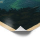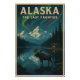 Retro travel poster of Alaska, USA. Majestic snow-capped mountains reflecting on a crystal-clear lake, towering pine forests, and a moose standing near the water’s edge. In the sky, the Northern Lights (Aurora Borealis) glow in shades of green and purple, creating a magical atmosphere
