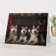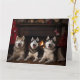 An enchanting scene captures the essence of cosiness and holiday spirit as furry companions adorned in Santa Claus hats gather around a crackling fireplace. The warmth emanating from the hearth creates a snug atmosphere for these adorable canines, while festive stockings hang in the background, enhancing the merry ambiance. The charming illustration portrays a timeless image of companionship and festive joy, perfect for celebrating the holiday season with a touch of canine charm.