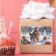 A heartwarming holiday illustration featuring a cheerful dog playing in the snow, wearing a Santa hat and surrounded by colourful gift boxes. In the background, children build a snowman beside a snow-covered Christmas tree, creating a joyful winter wonderland. Perfect for spreading holiday cheer and capturing the magic of Christmas.