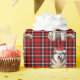 An adorable watercolor illustration of a Alaskan Malamute dog, pairs with a red, black and white seasonal plaid patterned background, and the dog wears a festive holiday hat.