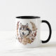 A pretty autumn wreath in tones of cinnamon brown, tan, and cream surround the watercolor image of a beautiful Alaskan Malamute Dog. The image is printed twice on the mug, with your custom text between them.