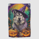 Embrace the Halloween spirit with this enchanting design featuring a cute dog in a witch hat surrounded by carved pumpkins. Perfect for adding a touch of spooky charm to your festive celebrations.