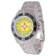 Has heft and feel of expensive stainless steel quartz watches. Good band with safety catch. I removed links, which is easy because engraved arrows show direction to push the linking pins. As always by this seller, the image (a railroad logo) is a perfect reproduction of my emailed image, and is precisely spaced and aligned.