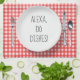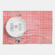 Alexa electronic device command for washing dishes on white dinner plate on red and white gingham pattern.