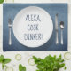 Alexa electronic device command for cooking dinner on white dinner plate and silverware.