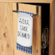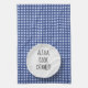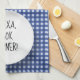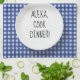 Alexa electronic device command for cooking dinner on white dinner plate and blue and white gingham pattern.