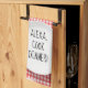Alexa electronic device command for cooking dinner on white dinner plate and red and white faded gingham pattern.