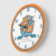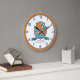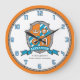 Knights style shield monogram letter A art name simple numbered wall clock perfect for a boys bedroom or playroom in shades of orange, blue white and grey. Personalise with your child's own name and name meaning for a personalised touch to your child's bedroom or nursery, this example is for names with the letter A. Currently reads Alexander A strong protector. Ardent defender of humanity. Ideal for a gift to a new baby boy, for a christening, baby naming or baby shower gift. Unique shield drawing, graphic art, name research, wording and design by Sarah Trett. www.sarahtrett.com for www.mylittleeden.com