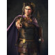 “Alexander the Great” - Conqueror of Empires. A stylised depiction of Alexander the Great. A young man in his late twenties with piercing blue eyes, standing confidently. He has long light brown or dark blonde, wavy hair. He wears a finely crafted bronze cuirass (breastplate) adorned with intricate engravings, possibly featuring mythological scenes or symbols of his divinity. Over his shoulders, he wears a short, flowing purple cloak (chlamys) fastened with a gold brooch at the right shoulder, symbolising royalty. He holds a hoplon (shield) and a spear in one hand and a stylised depiction of his Kopis (sword) in the other. A golden wreath encircles his head, symbolising his claim to divine ancestry.