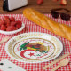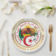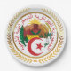 The national coat of arms of Algeria is infused into a circle shape rimmed with faux gold, and set amidst a faux gold laurel wreath.